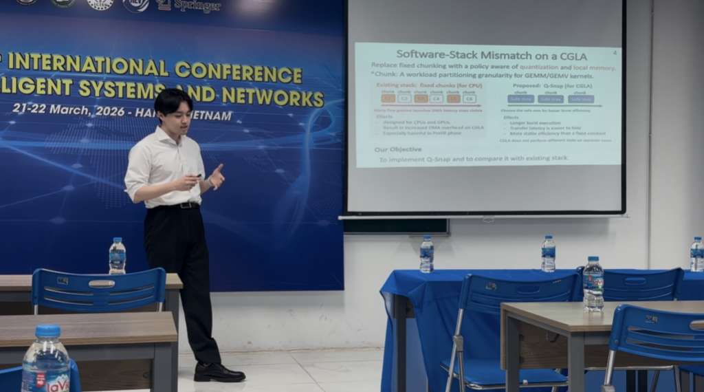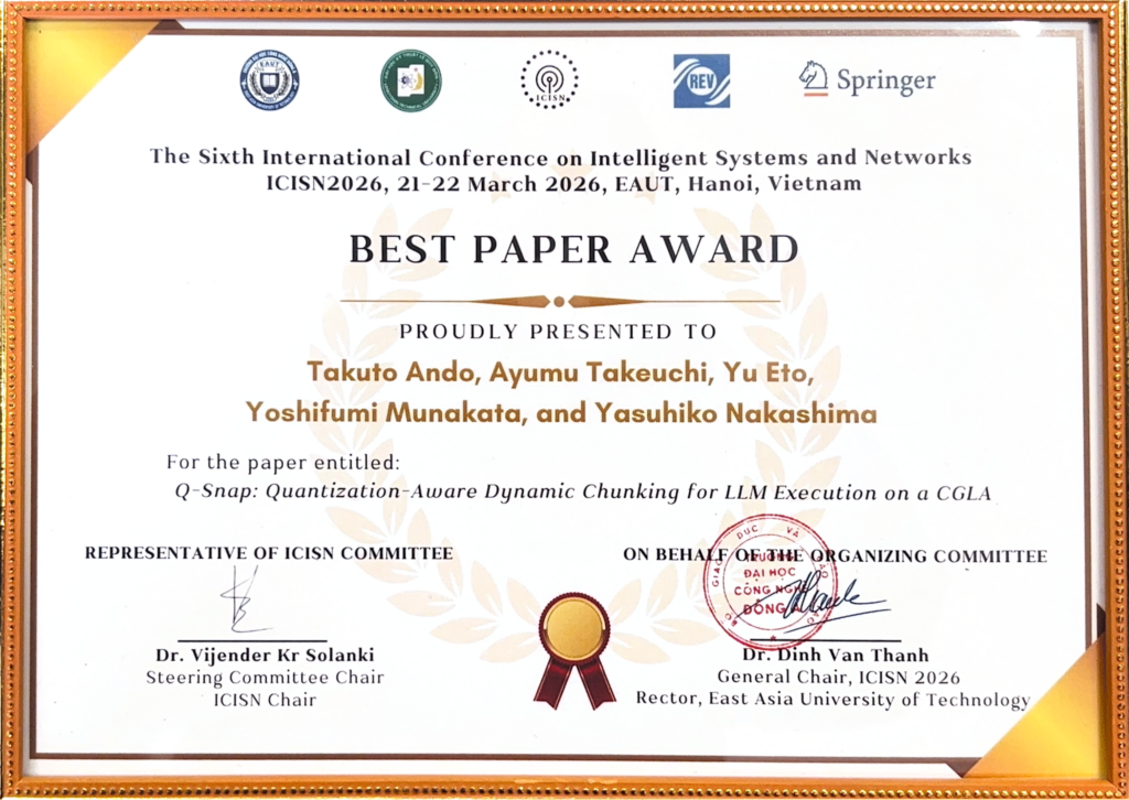 The paper, “Q-Snap: Quantization-Aware Dynamic Chunking for LLM Execution on a CGLA,” was presented by Takuto Ando, Ayumu Takeuchi, Yu Eto, Yoshifumi Munakata, and Yasuhiko Nakashima.
