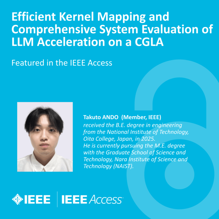 We are pleased to share that our collaborative research with NAIST, “Efficient Kernel Mapping and Comprehensive System Evaluation of LLM Acceleration on a CGLA” has been formally accepted to the international journal IEEE Access. You can access the full article for download here.